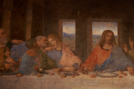 The Last Supper is magnificent. It was painted with tempera instead of fresco so it did not last as well and restoration is more difficult. Our guide described the scene, identifying each disciple and their emotional reaction to Jesus' declaring that there was a betrayer among them. Peter holds a knife, hoping to protect Jesus, and Judas clenches a money sack, reaches for bread (an indication of his guilt), and has knocked over a salt bowl, which means bad luck. None of the men have halos indicating they are human and no two faces are the same. Leonardo looked among the people of Milan to find countenances to include in the scene. The doorway to the refectory's kitchen was enlarged at one point which took out the part of the picture including Jesus’ feet. The table cloth and plates are painted the same as those the monks were using in the dining room. Da Vinci’s signature is in the lower left corner. His signature is a knot and is in the corner of the tablecloth.