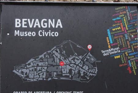 Since it was raining and foggy and we could not go rafting, Plan B was to visit another hill town, Bevagna. By now they are all looking alike – crooked streets and narrow alleys going up and down and some alleys with steps. The houses are all old stone plain walls. Some people try cheering things up with flowers in pots. There will be a main square and a main church.