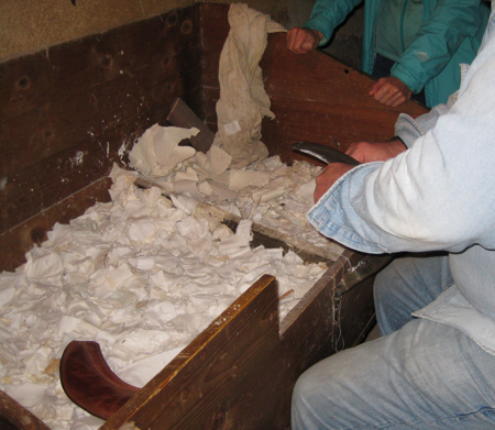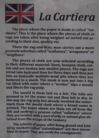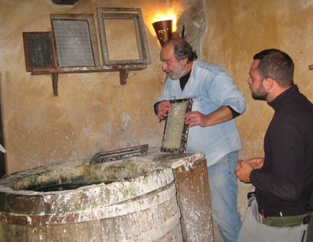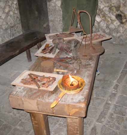 Bevagna has four contrada districts called gaites. Instead of a palio they compete in medieval arts and crafts. Today we visited craftsmen engaged in the medieval way of making silk cloth, minting coins, and making paper from cloth. In each location, someone demonstrated the entire process for us. It was interesting and educational.