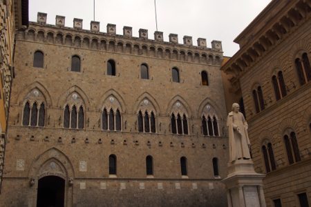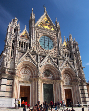 Today it tried hard to rain and we were prepared but it never did more than sprinkle. We spent six hours on a visit to Siena and saw a lot of what we had seen on last year’s tour starting at Santo Domenico Basilica (St. Catherine’s Church), which contains the relic head and thumb of St. Catherine. We stood in front of the Monte dei Paschi bank built in 1472 and “the oldest” bank in the world and we looked at the Church of St. Christopher (1260). He is the patron saint of travelers and the church is on the Via Francigena.