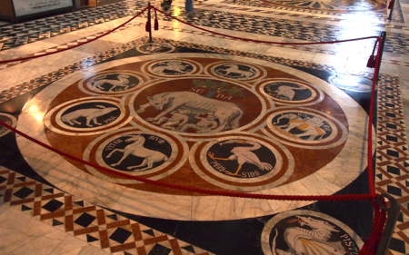 Tommaso disappeared and reappeared with the almond paste cookies called Ricciarelli that Siena is famous for. It gave us energy to continue walking up to the Cathedral of the Virgin Mary (Siena Cathedral) and stand in the piazza while our guide talked about the Cathedral, its crypt and baptistery, the duomo museum, and the facade that was to be an enlargement of the 1220 church. The Black Plague put an end to those plans. Later we bought tickets to enter the Cathedral (we had toured it last year but it is stunning enough to pay 7 € to see it again) and the Baptistery (4 €) that we had not seen. The Cathedral floor (marble with designs), ceiling, art, and the Piccolomini Library are wonderful. (See July 2, 2015) The Baptistery is not as impressive as the one in Florence but gave us a place to sit and rest.
