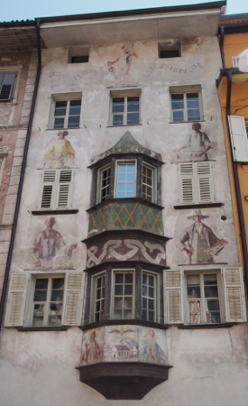 Our local guide arrived and we went on a walking tour with Luciano. We walked the cobbled streets to the Town Hall and its square and then down the market street where merchants once paid tolls. We walked into Grain Square with the weigh house to tally the tithe on the grain that was to be paid to the ruling Bishop. The town Cathedral is in the main square, Walther Square. It is a gothic structure and has a geometrically patterned tile roof. In the square is a statue of Walther von der Vogelweide, a 12 c. minstrel of love stories.