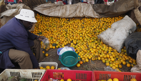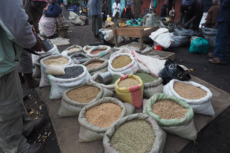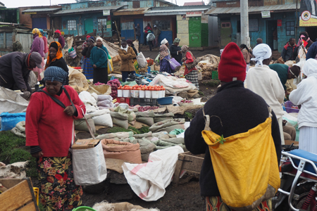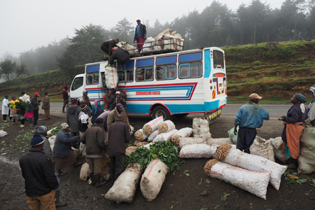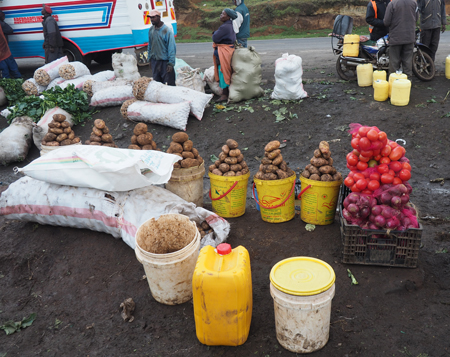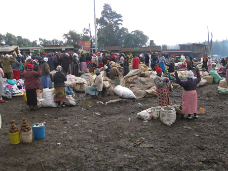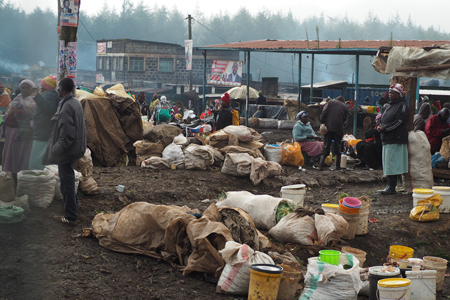 Today was a very long drive back south around Nairobi almost to the southern border with Tanzania - from Lake Nakuru to Amboseli National Park. Along the way we stopped at a regional market that sold vegetables from the local farms to middle-men who truck them to local villages. Three-hundred pound bags of potatoes, corn, carrots, and cabbages and sacks of spinach and kale were loaded on top of buses for transport. We walked in the mud among the sellers and buyers.