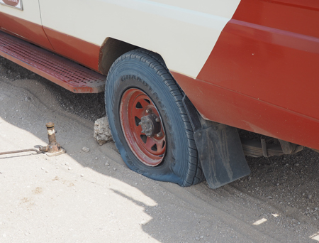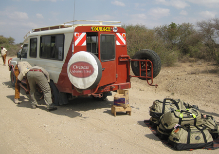 On the road again, we left the nice highway and began 70 km of washboard gravel road into Amboseli National Park. Before we got there our Toyota jeep got a flat tire. Steve and Witress had it changed very quickly. These vehicles get very hard use and carry two spare tires and many other repair parts.
