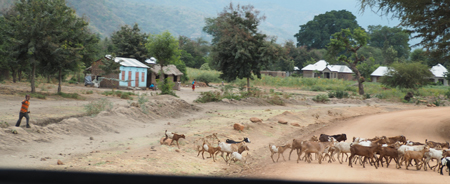 We stopped because cows were in the road. This is not an unusual occurrence but this time a boy was up high in an acacia tree over the road shaking branches so the seed pods fell onto the road for the cows to eat.