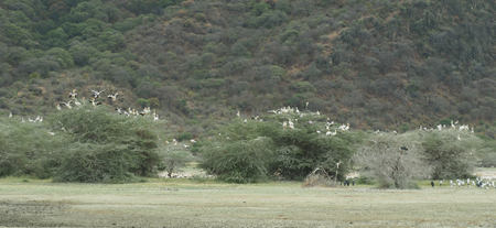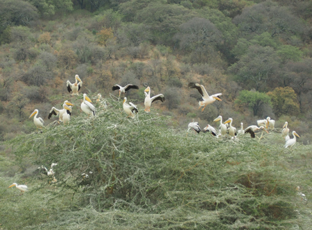 Lake Manyara National Park is 125 square miles and 2/3 of it is the lake. The lake is a nesting place for flamingos, great white pelicans, and storks and we saw thousands of them along the shore.