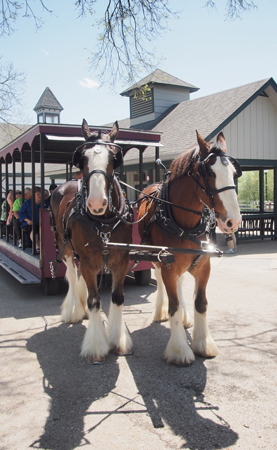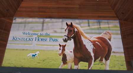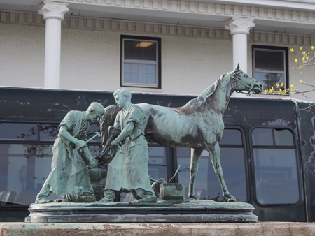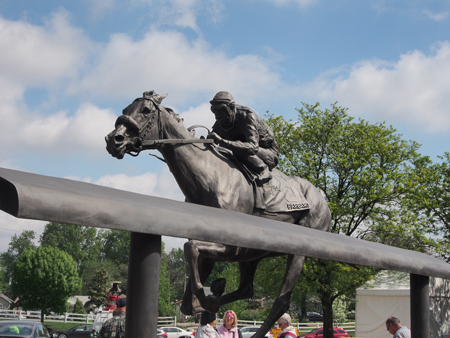 We ate another buffet (fried chicken again) at the Thoroughbred Center and then were bused to the Kentucky Horse Park, a wonderful tribute to horses. We first took the horse (Clydesdales) drawn trolley around the Park to get our bearings and then went to the show at the Hall of Champions. We got to see several past winners, learned a little about each, and watched clips of their greatest victories. We met GoforGin, DaHoss, WontheWest, and FunnyCide. Cigar was in his stall. We then watched the show called the Horses of the World. Six horses and rider/trainers demonstrated their horses. I liked the saddlebred prancer and the Spanish Jennet with a short stride and smooth ride. Another interesting part of the Park was the statues of famous horses that were buried there. Their head, heart, hooves and testicles are buried!