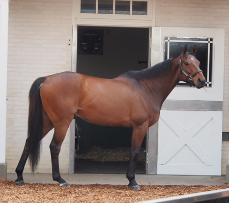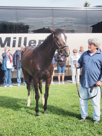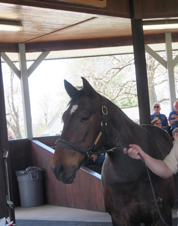 Next we listened to trainer, Mike Cameron, talk to us about his winning filly, Tellalittlesecret. She is 8 years old and has been, and still is, very successful. The horse walked and ate grass (yummy bluegrass) in front of us as Mike talked.