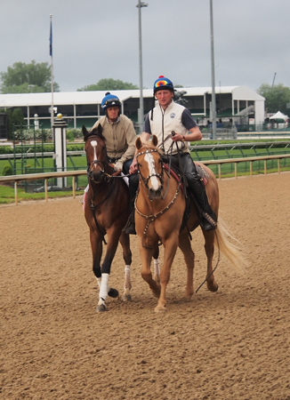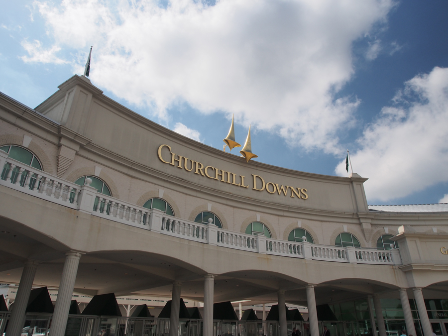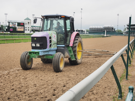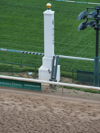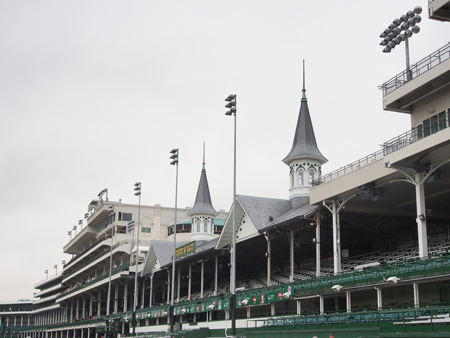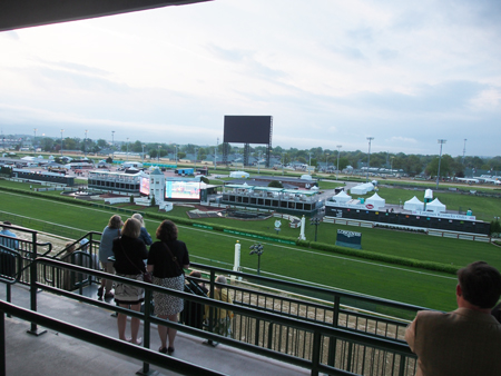 We began the morning with buffet breakfast in Millionaires Row at Churchill Downs. There must have been 2,000 people in the restaurant. Fruit, watery scrambled eggs, diced potatoes, biscuits and white gravy, waffles with stewed strawberries or apples all served on very fancy plastic plates with a plastic knife and fork. Juice we drank in plastic cups and coffee in paper cups. The napkins, however, were cloth! The view of the track from the fourth floor was great and we were at a table next to the window wall. The 7:30 exercise group was on the mile dirt oval. After we ate we wandered around Churchill Downs. We stood down at the track to watch the track being groomed for the 8:30 exercise group of horses. The horses are impressive when they thunder past. They are big and sleek and all muscle. It is amazing that 1200 pounds of horse runs so gracefully on four ankles each the size of a human wrist!