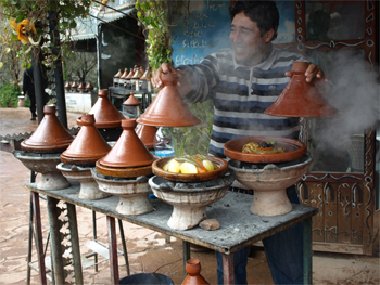 Jaafar had no suggestions as to what or where tourists in his home town might like to visit, so using the map Mohamed had given us and the two tour books Teddy and Barbara had, we found our own adventures on this "day of leisure." We walked to the Ensemble Complexe Artisanat and found a nice fixed price cooperative operated by seven groups of handicapped women. There was pottery, fabric, rugs, carved wood, pots and glasses for tea, and leather items to look at and admire without any hustling. We browsed through a variety of artisan’s shops and watched many of the owners working at their crafts. We always enjoy seeing how things are made.
