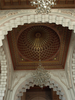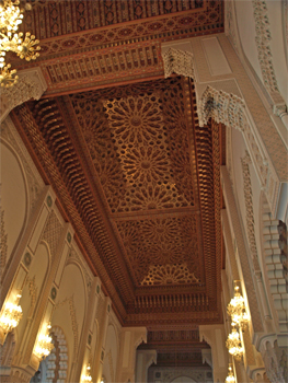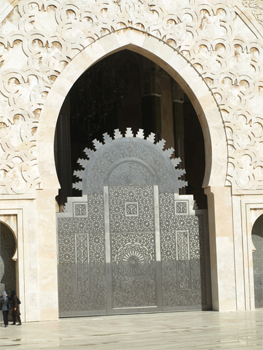 After checking into our last hotel we drove to the Hassan II Mosque. It even stopped raining and became sunny and beautiful for our visit and picture taking. The mosque is supposedly the "peoples' mosque" and can hold 25,000 worshippers inside and another 80,000 in the square outside. It is the third largest mosque in the world after Mecca and Medina (depending on your source of information). The 689-foot minaret is the tallest and has an elevator inside it. The whole complex is an architectural jewel and took only six years for 2500 workers and 10,000 craftsmen working 24/7 to complete in 1993. The French architect combined Arab and Islamic styles with wood carved and painted ceilings (carved in place and taking four days to complete each square meter of ceiling), sculpted plaster, mosaic tiles, and marble floors and pillars. All of the materials came from Morocco except the Italian marble pillars in the niche and one of the 57 chandeliers. The huge ceiling (65 meters high) slides open to let in sunlight on nice days. The huge doors are made of titanium so they won't rust from the seawater and then covered with gold leaf. There is a special entrance for the king. He walks down the length of the prayer room on red carpet and sits near the Imam. One third of the mosque is built out into the ocean because a verse in the Koran says: "The throne of God was on the water." Two hundred people a day clean, maintain and provide security.
