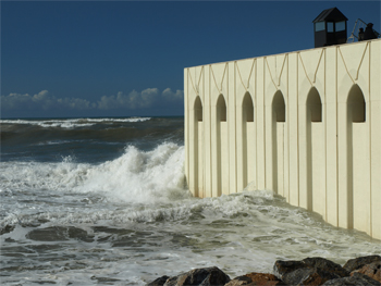Waves crashing against the third of the mosque which is above the sea |