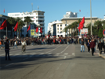 Jaafar evidently wanted to be part of the demonstration taking place in the Mohammed V Square, the city’s main square, and so he took us there. The square is surrounded by administrative buildings, parliament, post office, national bank, and foreign banking headquarters. Today it was filled with mostly young male protestors. They were orderly and organized and marched around a two-block area. The police and army in Casablanca lined the perimeter of the square and stood almost shoulder-to-shoulder with riot helmets and batons but they had empty holsters - no fire arms.