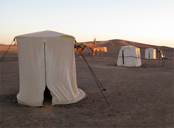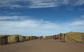 We finally made it to our tent camp in the desert – Daya el Maider. There are two rows of ten 2-cot tents with Berber rugs on the floor and one solar fed electric bulb and one nightstand. Each cot has 3 of the heaviest blankets I can remember ever being weighted down with - but they are warm! There are 5 pit toilet tents behind each row of sleeping tents and four shower tents with a hose hanging from the top. If you want a shower, the camp staff will heat some water and pour it into the bucket on top. It was too cold for any of us to even think about taking a shower.