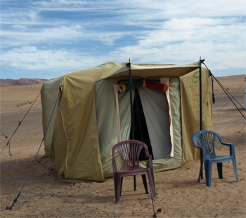 The meeting and dining tent is large, has tables and chairs so we don't have to sit on the floor for meals and is sort of inviting. The kitchen tent was small with three propane hot plates. It is amazing the wonderful meals they prepared in these bare amenities. It is a simple camp but rather appropriate. Before dinner we had "high tea" with cookies, almonds, and peanuts and a cooking class where the camp chef prepared a tagine for us. We had the same recipe for dinner with the wine we bought in Fes. After the bouncy ride over unpaved and rutted sand roads, we were ready to enjoy a glass of wine and a hot meal.