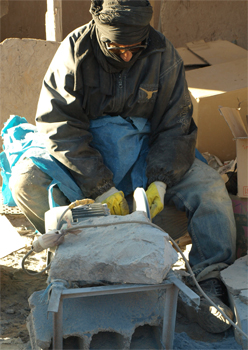 Worker grinding rock to expose fossils