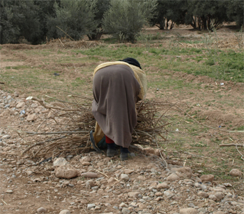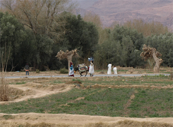Next we walked among the village valley farm plots. A farmer pays for the diesel fuel to pump well water onto their plots. Later we stopped and used a woman's tool to try cutting some alfalfa like she did. The alfalfa is put onto a shawl and bundled together to carry on her back to her animals. There were also many almond, date and olive trees in this public farm area.