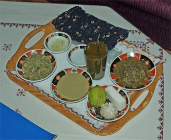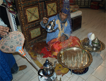 Next we went to a lady's home in town and learned about henna and all of us got tattoos. Henna is grown locally, dried, and crushed into a powder with a pistil and mortar. The powder is mixed with water to make a paste. The woman used a syringe with a cut needle and squeezed out designs like she was decorating a cake. After the henna dries on your skin (with some help from a heater), it is "set" with a "sauce" of garlic, sugar, lime, and black pepper. Marge got a design on her left hand and I got a bracelet drawn on my wrist.