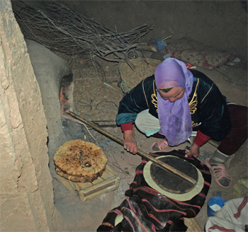 We stopped at the 12th c. caravansary, which is a group of kasbahs in Ben Ait Benhaddou. Twelve families are living here and working on the restoration. The kasbah we entered and climbed to the top of, had a courtyard for caravan animals, many small rooms for storing trade goods, and four lookout towers used as silos for wheat and barley. Mohamed took us into a "house" kitchen where a woman made bread for us. It was warm with a smoky flavor. I think all 16 people in our group love Moroccan bread!