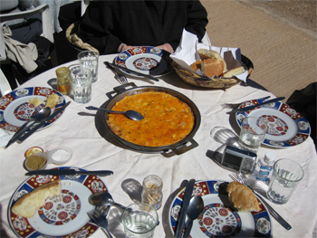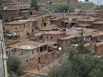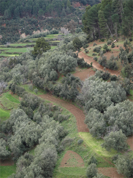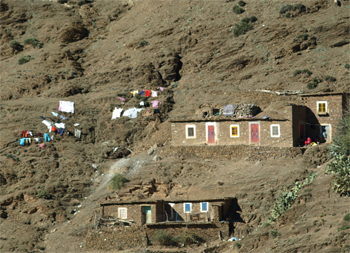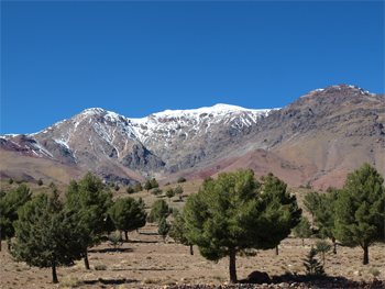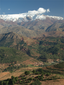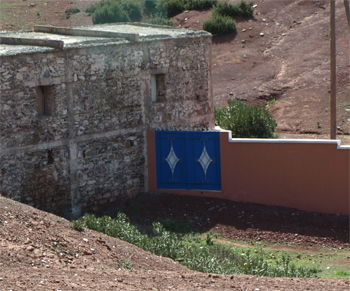 We crossed the High Atlas at Col du Tichka pass - 2260 meters (7415 feet) high. The landscape changed to smaller farm plots and villages and walnut trees and pine and cedar. The road over the pass was at least 60 km of very narrow, windy road built by the French around 1930. The colors on the mountainsides varied from green to red and brown and gray with snow at the top. On the west side things became greener and the farms larger, but still small enough to be worked by hand or donkey. We drove through a forest of pine and oak trees which is a government owned reserve for hunting wild boar - mostly by Spanish and Italian hunters.