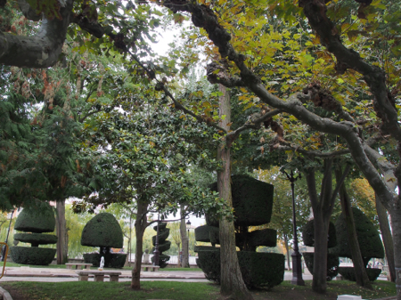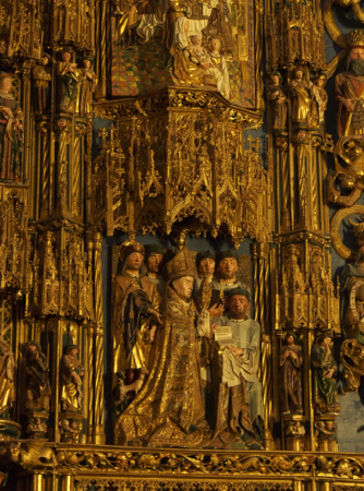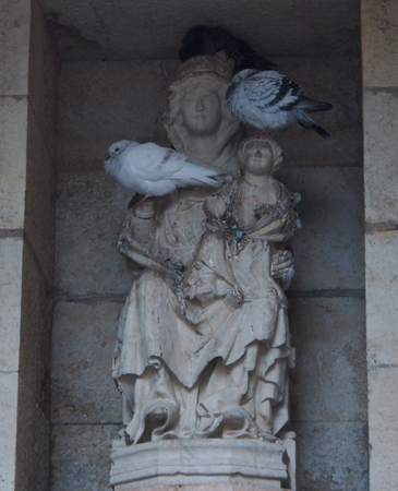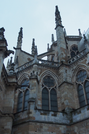 Our first stop after three hours in the cramped bus was in Burgos. Our local guide, Luis, took us through the ornate Santa Maria Gate and then on a tour of the large, gaudy 13th c. Santa Maria Cathedral. Only two chapels are used for prayer and mass and the rest is a tourist business. The main nave is carved from black walnut and most of it is gilded. There are 38 altarpieces in the church. The 1099 grave of El Cid and his wife are in the center of the cathedral. The choir has 103 carved mercy seats. There are 2500 organ pipes and some of them are horizontal, like trumpets. The Golden Staircase leads to a door to the Camino de Santiago.