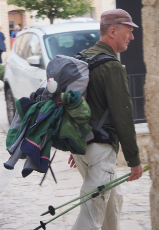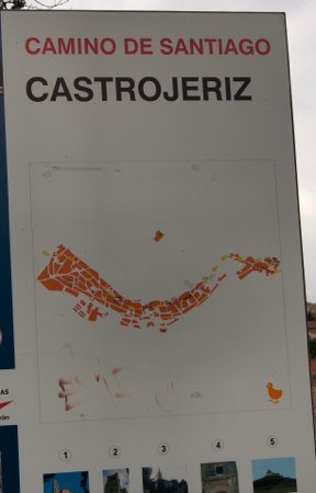 After another 1¼ hours on the bus we got off to walk our second part of the Camino. The path was the main street of Castrojeriz, a town of B&Bs for today’s pilgrims. The church of St. Mary of the Apple Tree was closed but we had time for a cup of coffee, “Americano cafe, negro.”
