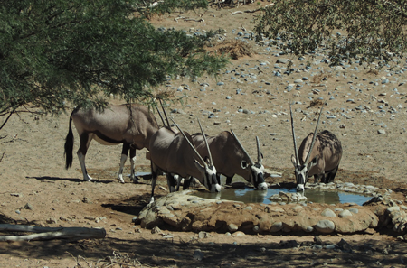 Our options this morning were: an expensive balloon ride in the desert, a 7 AM nature walk with our drivers, or time to enjoy the scenery and animals around our lodge. We took the third option! We slept as long as we wanted, had a regular breakfast with cooked eggs and bacon, and then sat out on our porch in the shade and watched springbok and oryx closer than we have seen them from the vehicles. It was so quiet and peaceful.