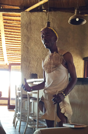 At 2 PM a guide, who happens to be an educated San bushman, spoke to our group. There are several San tribes or groups in existence in Namibia but they are not as protected by the government or exempt from some government rules as they are in Kenya. They are not allowed to hunt wild animals in the national parks and have to exist in small areas on private game reserves. These areas are shrinking. The Bushmen are not allowed to go naked in “public.” Among other things he told us about ostriches. The Bushmen used to skin an ostrich and wear it to hunt. The skin covered their legs and the head was held up with a stick. (One ostrich egg is equivalent to 24 chicken eggs. The silly birds can run 60 MPH.)