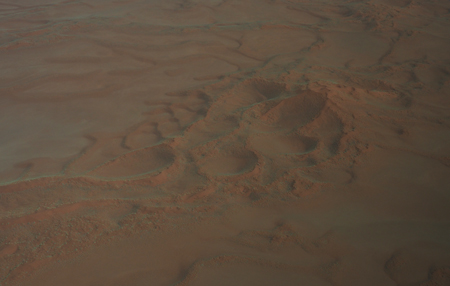 We had plenty of time to get ready for our 10 AM flight from the gravel strip to Walvis Bay on the Skeleton Coast. The pilot delayed us 15 minutes so the fog could clear enough to land. We flew at 6,600 feet and could see the red sand dunes south of the east flowing Kuiseb River, the deep wash of the river filled with trees but no water now, and barren gray rocky outcrops and tan sand.