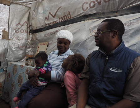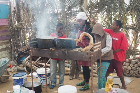 On the way to the Dantago Community, a Democratic Resettlement Community, founded in 2001 as a temporary resettlement community for people waiting for subsidized housing in the city. It was initially built mostly of reclaimed garbage from the city landfill. The government has a plan where a man can buy a lot, build a one-room dwelling, and add a room later. The government lends them $30,000 to do this. They have seven years to pay it off or lose it. If they spend their money on a second-hand car or alcohol they will not be able to pay off their loan. The government is starting another section with two room houses for $80,000. In the meantime (the waiting list is long) people live in hovels made of cardboard, odd pieces of wood, or parts of old cars. The conditions are pathetic and inhuman and that is where we visited a day-care center and made soup out of our cabbages and things and then served about 50 neighborhood children.