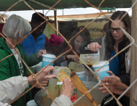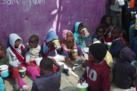 Back at the center the kids lined up and the older child leaders helped distribute the hot soup we dished out into plastic containers like ice cream may have come in. The kids sat on the floor and ate with their fingers! Several came back for seconds. It was the only meal some of the kids would have today.