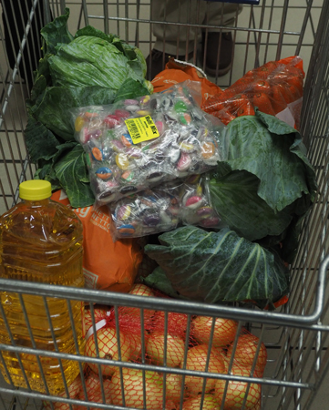 First we went to the Pic and Save market around the corner from our hotel and bought 3 cabbages, 7 kg of potatoes, 2 bags of carrots and 2 of onions, a large package of elbow macaroni, and 4 packs of Knorr’s vegetable soup mix. I added 2 large packs of candies.