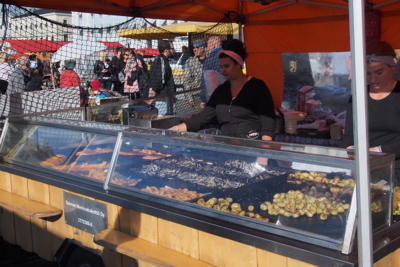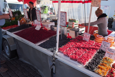 Before looking for a dinner restaurant, we strolled around the booths in the open air market (there were at least 50 of them) where vendors were selling fruits, vegetables, fish, flowers, wool things, fur hats and boots, souvenirs, etc. One thing we learned is that the little red berries we thought were cranberries are lingonberries. Cranberries are only grown in the US.