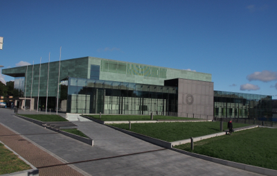 We stopped at the new Music Center opened in 2012 to use the free toilets. The concert hall is a unique design. The seats are at different levels and oriented to the “stage.” The university of music and the philharmonic are housed in this modernly designed building. The lobby contains a beautiful, modern, glass chandelier which was casting reflections on the walls as the sun shone in the windows. The red tower that reflects in the outer glass wall is the museum of history.
