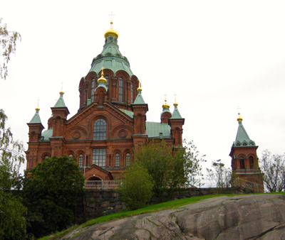 At 10:30 we started our city tour of Helsinki by bus. It was the same tour that we took from the Holland America ship in 2007 but in reverse order. The red brick Orthodox Church near our hotel (Uspenski Cathedral) is closed inside for restoration. We passed by the three icebreakers in the harbor. They can easily open and sail through six feet of ice but are not very stable in open water. Finland is trying to reduce their use of coal for heating. We saw the huge pile of coal at the power plant. Sixty percent of Finland is forest but most of that is privately owned. We stopped at Senate Square with the office of the Prime Minister, Helsinki University, and the St. Nicholas Cathedral (it once had a bishop) built in 1852 on the highest piece of land in Helsinki. It is now a plain Lutheran Church. It has statues of the Apostles on the roof. The statue of Russian Duke Alexander II of 1863 stands in the square. More important, below him stands the symbol of Finland – a woman with the sword of defense, shield of protection, and lion of courage. We looked at the white building with green roof on an island that is the oldest sailing club in the world.