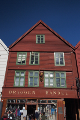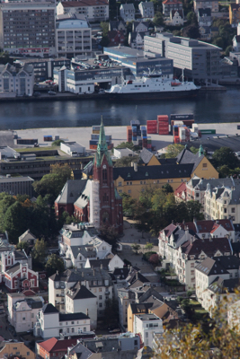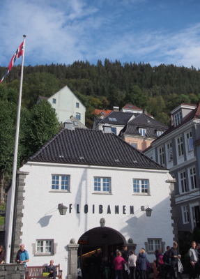 After disembarking at 2:45, we loaded onto a motor coach and Eva took us on a tour of Bergen. Bergen is the second largest city in Norway and is where Eva lives. We got off the bus for a 15-minute walk in Bryggen where the old warehouses for the port are. Since Bergen has had 36 fires over its history not many of the buildings are original. The Bryggen area was built on the rubbish of reclaimed land and the buildings lean and have to continually be re-supported. It is the touristy area and is made to look like it was when the Hanseatic (German) merchants operated the wharfs. In the 1500’s as many as 200 ships a day docked briefly to unload and reload.