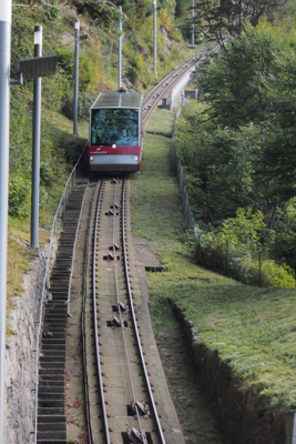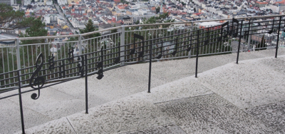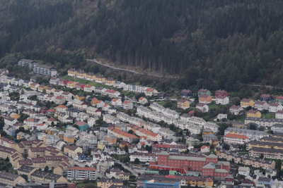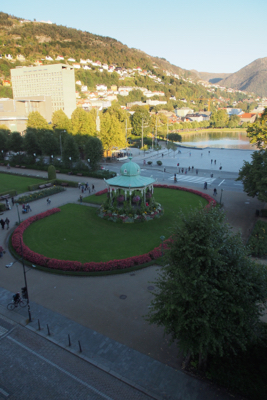 Further down we stopped at an overlook at Floydalen and sat on a bench to eat our lunch – I had made sandwiches at the breakfast buffet – and admired the city below us. We could see all the way to the west to an oil rig in the fjord. The last time we were here it was a rainy, misty, foggy day and we could not see much at all.