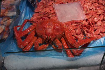 We did not join Eva for the optional tour this morning to see how fishing villages have turned into towns supporting the new offshore oil and natural gas terminals. Instead, we first walked around town a little and then went through the new fish market building. It was like a store instead of the fishermen selling from their boats or under tents like the last time we were here. The price of the fish is much higher because of the rent in the new building. Some of the cases had fresh and smoked whale meat, the usual shellfish, salmon, halibut, cod, and even lutefisk.