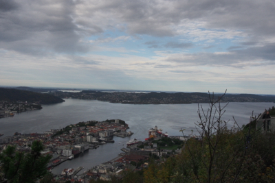 We rode the Funicular up to the top and walked in the woods in the park on top of Mt. Floyen. It was not raining and the clouds cleared away and maybe that is why every child in Bergen between the ages of 3 and 7 also went up the funicular with their teachers and chaperones. The peace and quiet of the woods was shattered by the high-pitched voices of children enjoying the outdoors. They were cute but ran around like bees near a hive.