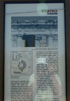 Next we drove to Nysa, which is an archeological site that few tourists visit. It has a well preserved Greek theater built into the side of the mountain. On the stage (added by the Romans) were more bas relief sculptures of Bacchus to whom the city was dedicated. (Link to further information about Nysa - use the back arrow key to return here.) The city was covered by a very productive olive grove. When the government claimed the land as an historical site, the farmers were allowed to continue growing and harvesting olives. The trees were full of green, unripe olives. This dig was begun in the 1960’s by a New York University professor and is continuing today. Some of the areas have revealed artifacts of earlier residents, dating back to 2800 to 2200 BC! It is incredible the way it seems that you could dig down eight to twelve feet almost anywhere in Turkey and uncover prior civilizations. Several columns are standing in the area of the agora or marketplace but much more work needs to be done. The Odeon (political theater) is well reconstructed.