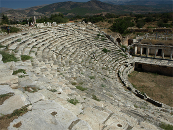 At 8 AM we got on the bus for a 2 and ¾ hour ride (with one rest stop at a gas station) to Aphrodisias. It is an ancient Roman city (5th century BC) dedicated to Aphrodite, the goddess of love. In the 13th century AD it was abandoned and the city was buried by a series of earthquakes. We walked past a bunch of sarcophagi and burial urns unearthed at the site. The marble slabs were ornately carved. (Link to further information about Aphrodisias - use the back arrow key to return here.)