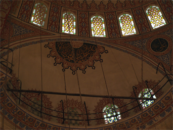 A mosque building has a central dome supported by four large columns called “elephant feet.” There is a loge for the local ruler or sultan to pray from and another loge for the man who makes the call to prayer from the minaret. Today he uses a microphone instead of chanting from high in the minaret. The “altar” always faces Mecca and the Imam faces east to pray. The main floor of the mosque is carpeted for the men to kneel on. The women are separated and stay up in a balcony around the sides and back of the men’s area. When someone dies the family usually gives a carpet to the mosque. The wealthier people and the royal families give large expensive carpets. Most of the wonderful old carpets have been stolen from under the newer ones and taken to the US and Japan and sold. Many of the tiles contain symbols of three things - the tulip (which originated here in Turkey and was taken to Holland in the 16th century), the carnation, and the artichoke. (Link to more information about the Blue Mosque.)