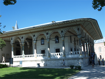 A gold ostrich egg hangs from the ceiling of the inner or Felicity Gate - you can barely see it in the left picture, if you look hard. It supposedly keeps spiders and spider webs away. A stone in the floor was used to hold a Turkish flag. If the flag was missing, Turkey was at war. Inside this gate is the building called the “divan court ” (hence the derivation of our term for a divan or sofa) where heads of state met with petitioners to hear their complaints. The officials lounged on the divans. The building was like the Sultan’s “Oval Office.” Inside there is a golden throne over the headman’s divan. They used running water to muffle the sounds of the conversations held there.