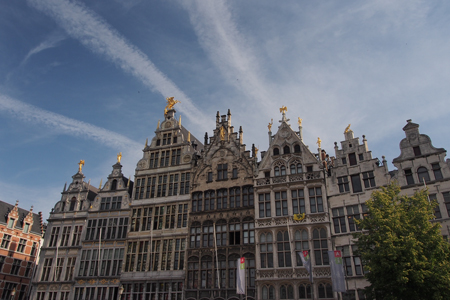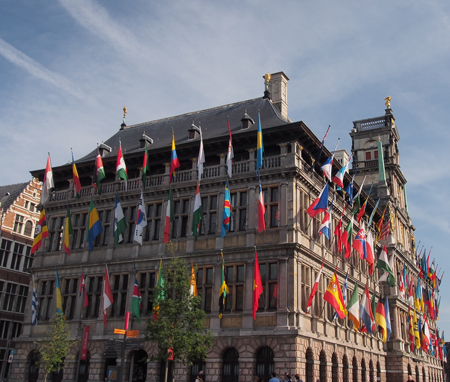 The city hall dominates the main square. It is decked out with the flag of every country that has an embassy in Antwerp. There is no US flag because our embassy is in Brussels. The ground floor has iron or wood doors where merchants had their markets. Several Guild houses with symbols on top representing their trade lined another side of the square.