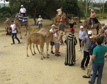 We boarded another bus in Tangier and got a Moroccan guide. He told us that 300 ships a day pass through the Strait of Gibraltar. Tangier has both Mediterranean and Atlantic beachfront and has all the charm of an old Moroccan Kasbah and medina. Tangier has been controlled by eight different empires/countries in its history - Phoenician, Roman, Arab, France, Spain, etc. We drove through several different international neighborhoods - French, Jewish, Spanish, British (with its golf course and cricket pitch), American, and the rich. Morocco was the first sovereignty/country to recognize the US in 1776 and there are many rich Americans who have lived here. We stopped at a camel ride vendor to give those who wanted to an opportunity to briefly ride a camel.