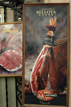 In Rhonda we walked to La Casa Del Jamon, which sells the expensive cured Iberico pig legs (ham - Jamon Iberico). It is salted and dried for 2 or 3 years and is sliced thinly off the leg held on a meat hanger. It is very expensive and melts in your mouth. The hams were all hanging by their feet along the walls of the shop.