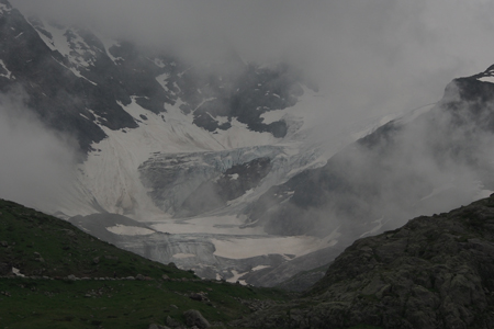We got back on our motor coach at Andermatt and rode over the zigzag road with hairpin turns (requiring both traffic lanes for our bus to make the turn) and with shear drop offs to cross the Susten Pass on our way to Interlaken. The Susten Pass, where we made a stop, is at 2200 meters and is at the foot of the Stone Glacier. The clouds descended on our way up to and over the Pass. Visibility was limited – perhaps a good thing given the nature of the road.