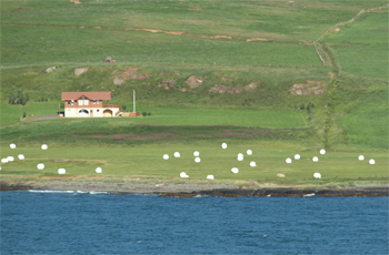 We sailed at 5 PM and saw the neat summer homes of people who live in Reykjavik, which is 160 miles away. There are some farms along the gentle slopes of the fjord and we saw more "marshmallows for the trolls." These are the white plastic wrapped hay bales! Because of the Norwegian influence on the Icelandic culture, there are trolls everywhere here!