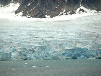 The weather was bright and clear, but not sunny, so our captain sailed into Magdalenefjorden at 5 AM. He went in to about one mile from the large terminal glacier at the end of the fjord and stayed there for about two hours. We were up on deck from 6 to 8 AM. Our ship lecturer, Frank Buckingham, gave a running commentary on glaciers and ice and moraine formations. We heard about aretes (saw-toothed ridges), nunataks (exposed rocky elements on a ridge – points sticking up), ice caps, ice bowls and cirques, moraines (terminal, lateral, and medial), icebergs, growlers (ice floating up to 3 ft out of the water), bergy bits (small icebergs 3 to15 ft out of the water), and brash (accumulations of floating ice). We saw no calving from the three terminal glaciers of the 15 or so that are in this fjord. It was cold up on deck 13 but well worth the view and we had several layers on to keep us warm. Of special interest was a Polish expedition camp on the north shore set up with four tents, a zodiac boat, and lots of scientific instruments.