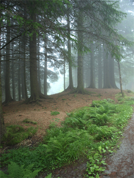 We hiked/walked on the crushed rock roads to Skomakerdiket, a cute little lake with a bunch of camp kids canoeing and having noisy fun. We went on up to Blamansvatnet Lake but couldn't see it for the fog, headed toward Rundemansveien, but got on the wrong trail so we headed back to the Floibanen to return down into the city. Our rain jackets and hats and Gortex boots dept us dry in the mist. It was great to get out and exercise after two days at sea and the fir and spruce trees and ferns, flowers, and moss were nice after the barren tundra above the Arctic Circle.